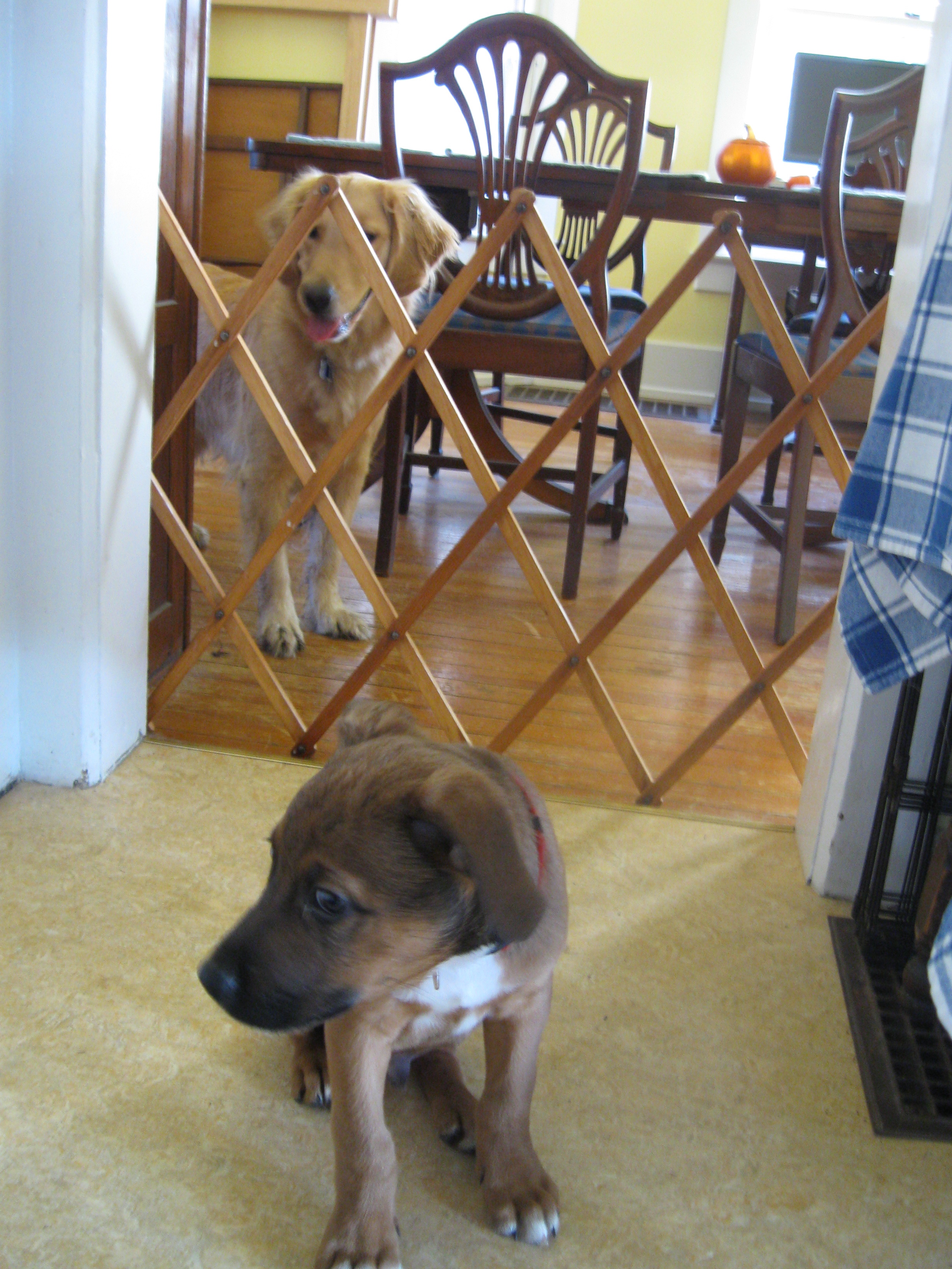 I love the picture of Honey looking at Scooter from behind the gate. It’s like Honey’s thinking, “Why did you put my new playmate behind this thing? I wonder if there’s a way I can get it open.”