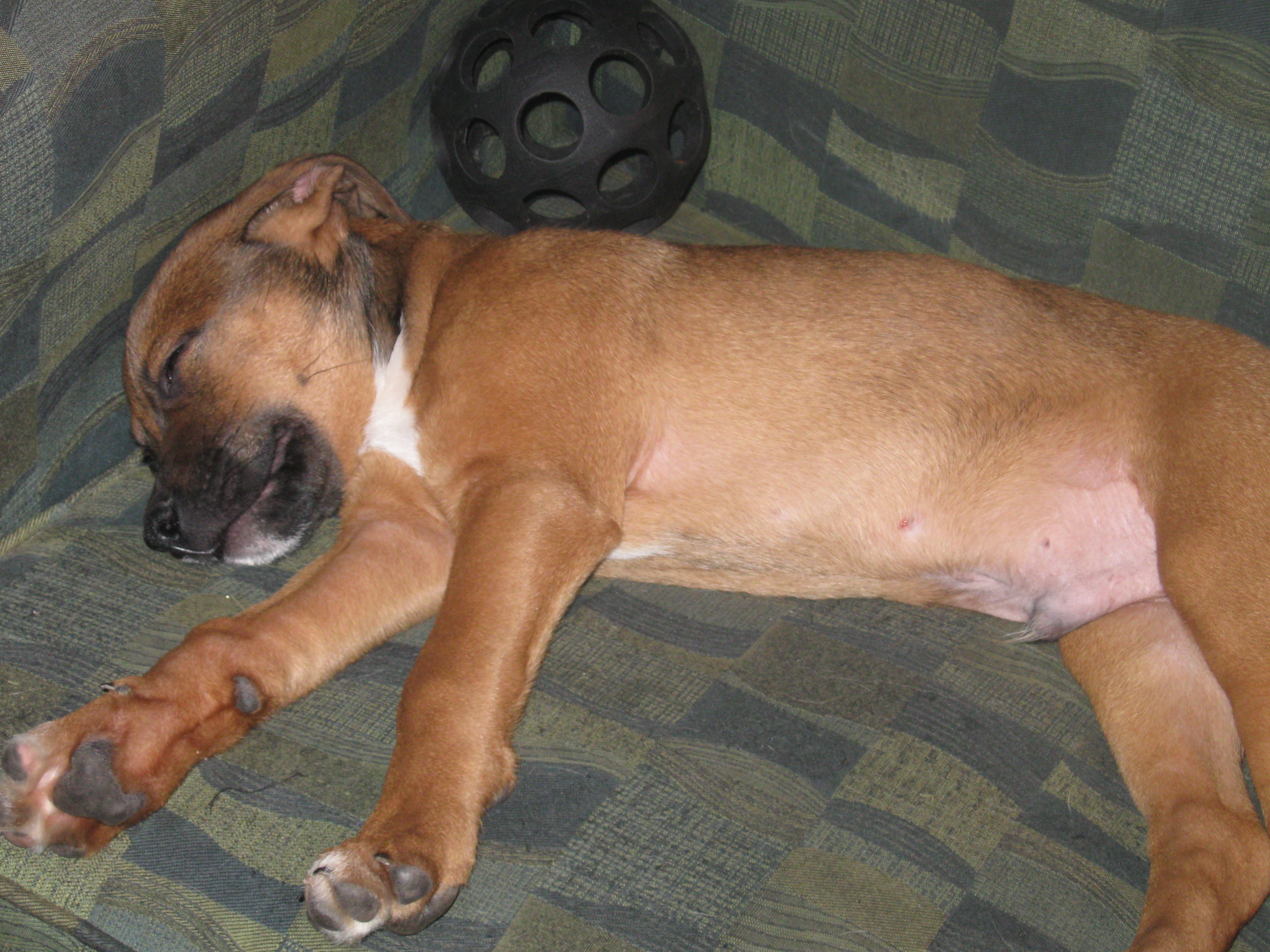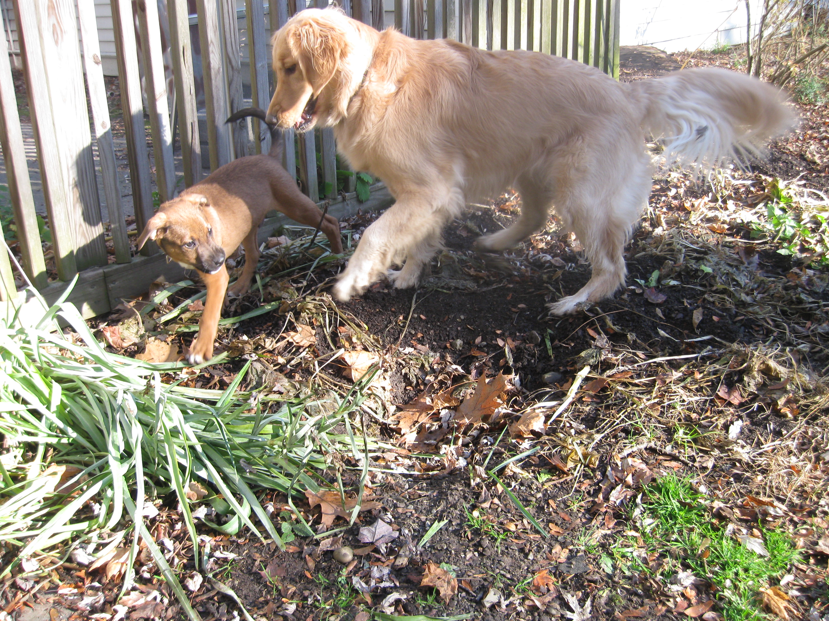 12:30 p.m. TFM and TFD walk in for lunch to find Scooter laying peacefully beside his crate and Honey upstairs on the couch. Everyone goes out in the yard for a break and game of bitey face.