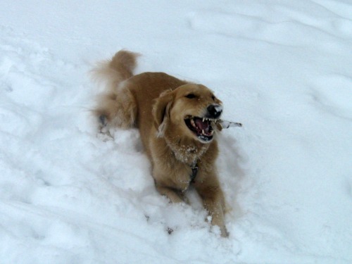 Honey the golden retriever enjoys her stick.