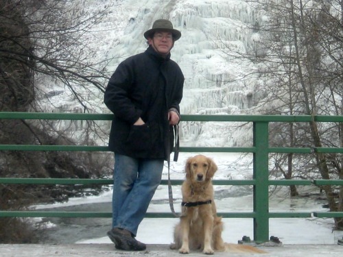 Honey the golden retriever with Mike at Ithaca Falls.