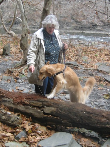 Honey the Golden Retriever on the log at Ithaca Falls