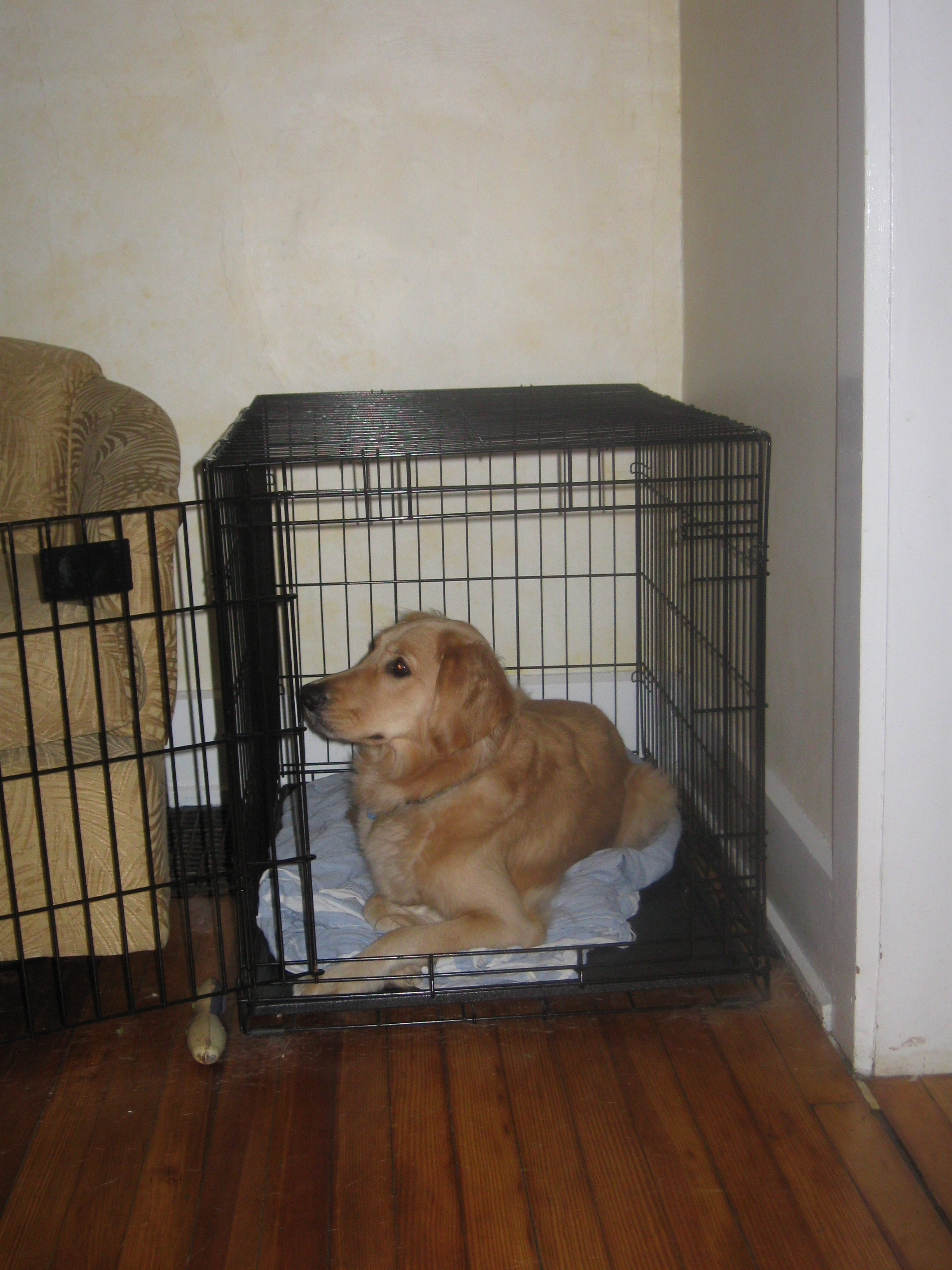 Golden Retriever in Crate