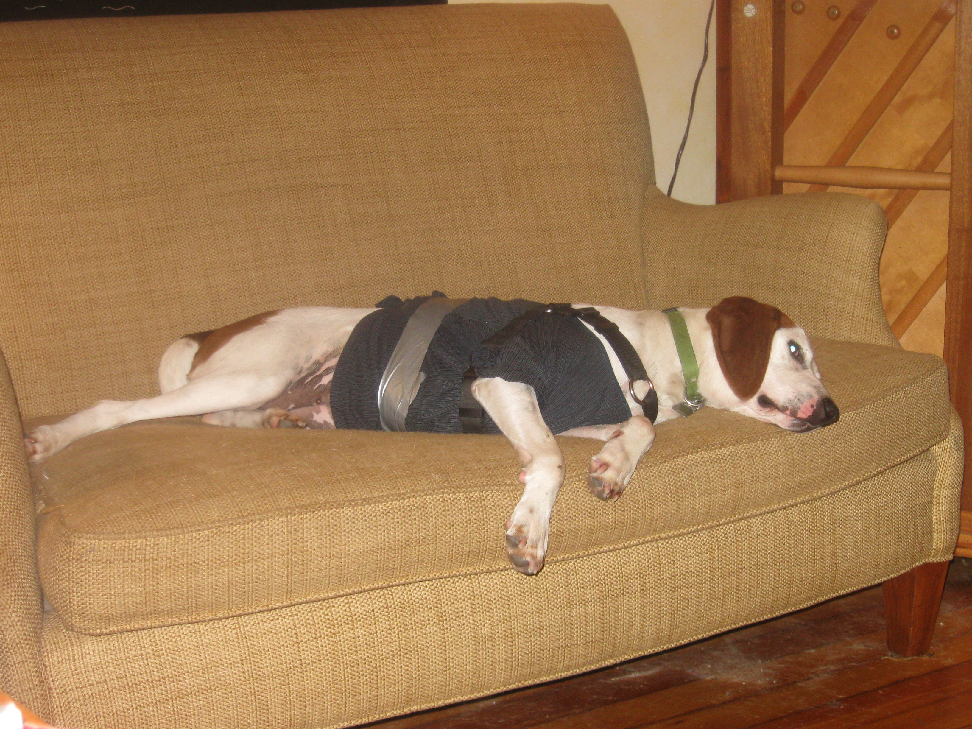 Because of the severity of her reaction, Russ, our trainer, suggested I try D.A.P. Dog Appeasing Pheromone Spray (60ml) and a Thundershirt. With severe storms expected throughout the day, we were able to get the DAP spray but both local pet supplies were out of large size Thundershirts. So I followed some instructions online to create one using a t-shirt and some duct tape.