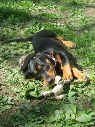 Way too cute and boy, plays well with Honey. I like “Sally,” but also Bertie for Bertrille. So glad I don’t live closer….wondered if she were a black and tan Coonie till I saw her legs :).