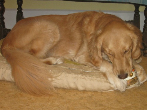 Honey the Golden Retriever cleans out the peanut butter jar.