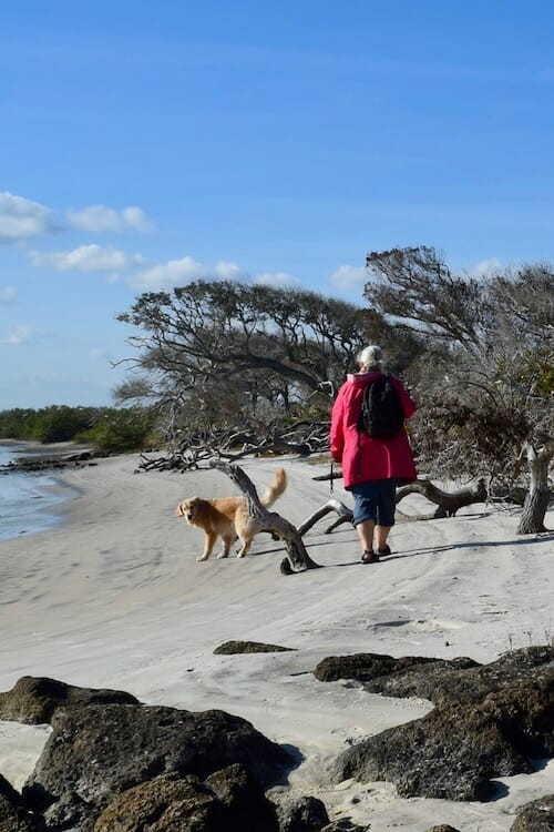 Although Mike never rushes Honey on travel days, she does her business quickly and is less likely to play. She knows we’re getting ready to weigh anchor and she wants to get back to the boat as quickly as possible. Honey appears to want to return before I leave without them. She’s smart, but not smart enough to realize that in 2 1/2 years, I have yet to move the boat before she and Mike return from a walk.
