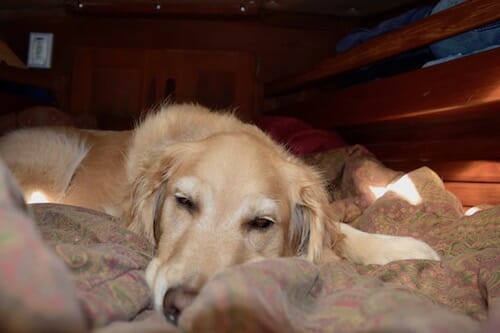 As a result, she’s usually calm when we leave her on the boat—sometimes even continuing to doze under the table as we leave. But living on a boat, Honey appears nervous at some separations.