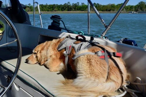 Every travel day, Mike takes Honey off the boat. Then, while they’re gone, I get the boat ready so we can leave as soon as the outboard is back on the stern rail and the dinghy is in towing position. Doing things the same way every time helps Honey know what to expect. And most of the movement happens while she is off the boat.