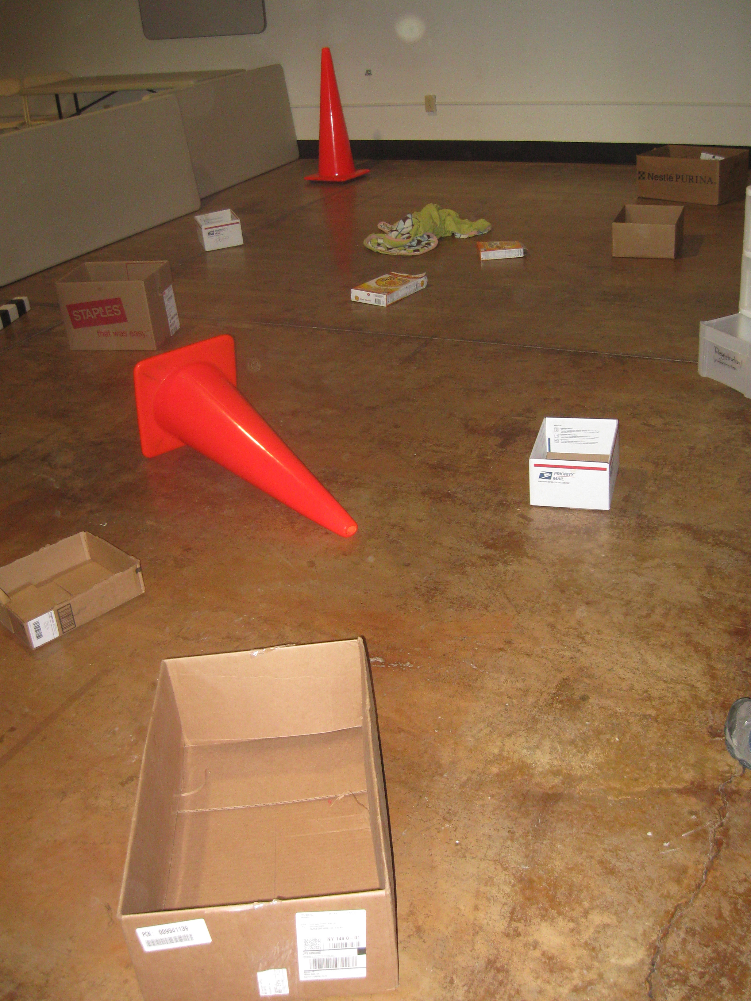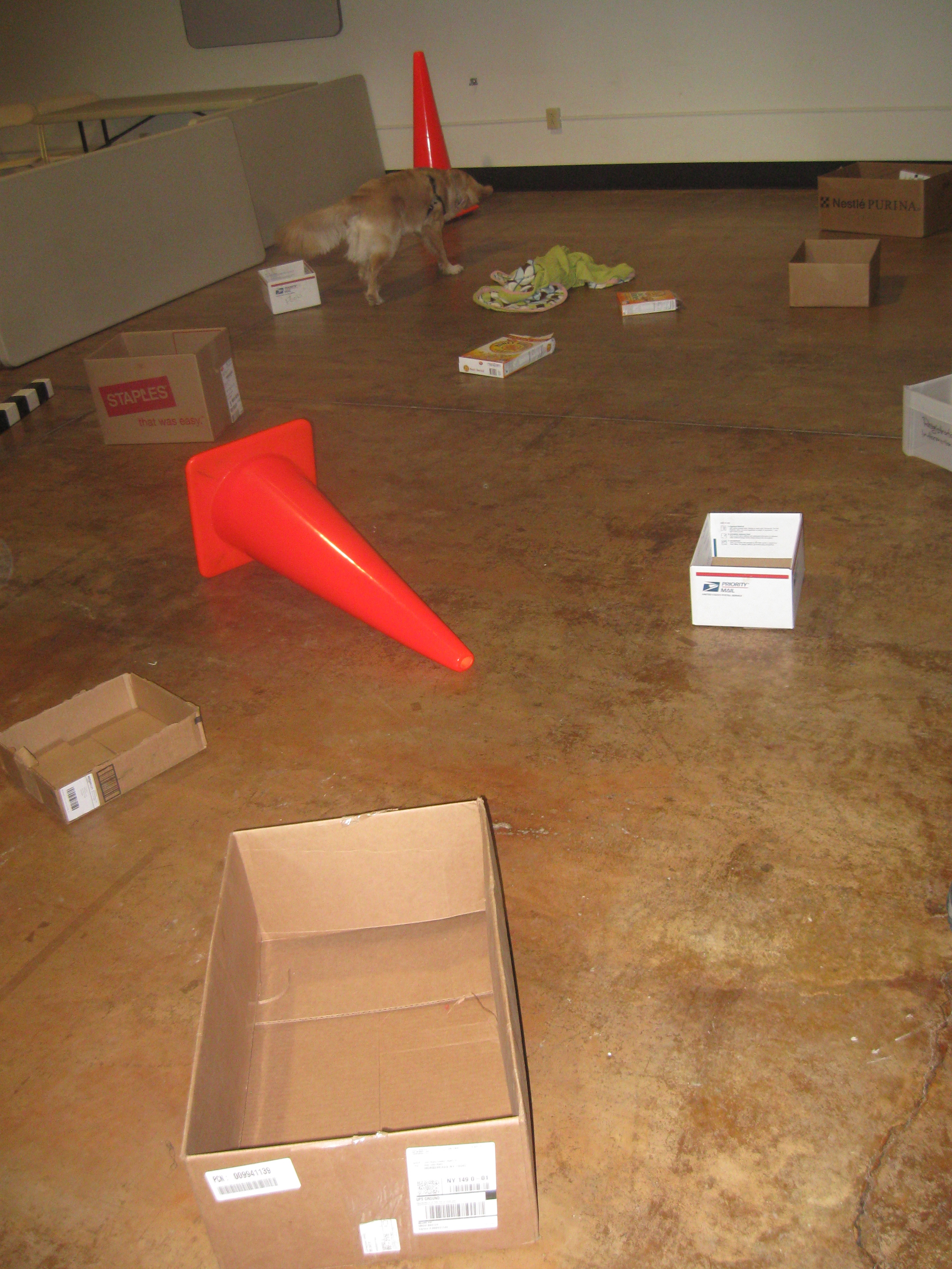 After practicing at home for a week, we came in last night to see some small changes made to the course. Added to the boxes were some new objects (traffic cones, agility equipment, furniture) for the dogs to search in and around.