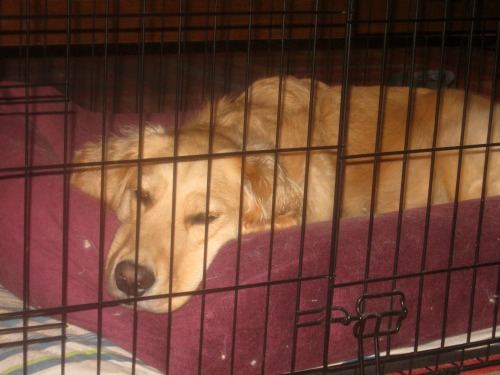 Honey the golden retriever naps in her crate.