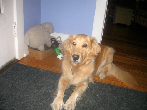 Someone comes to the door. Honey pads over to her basket of toys and looks for just the right offering. She returns to the door to greet the visitor, now holding the precious toy in her mouth.