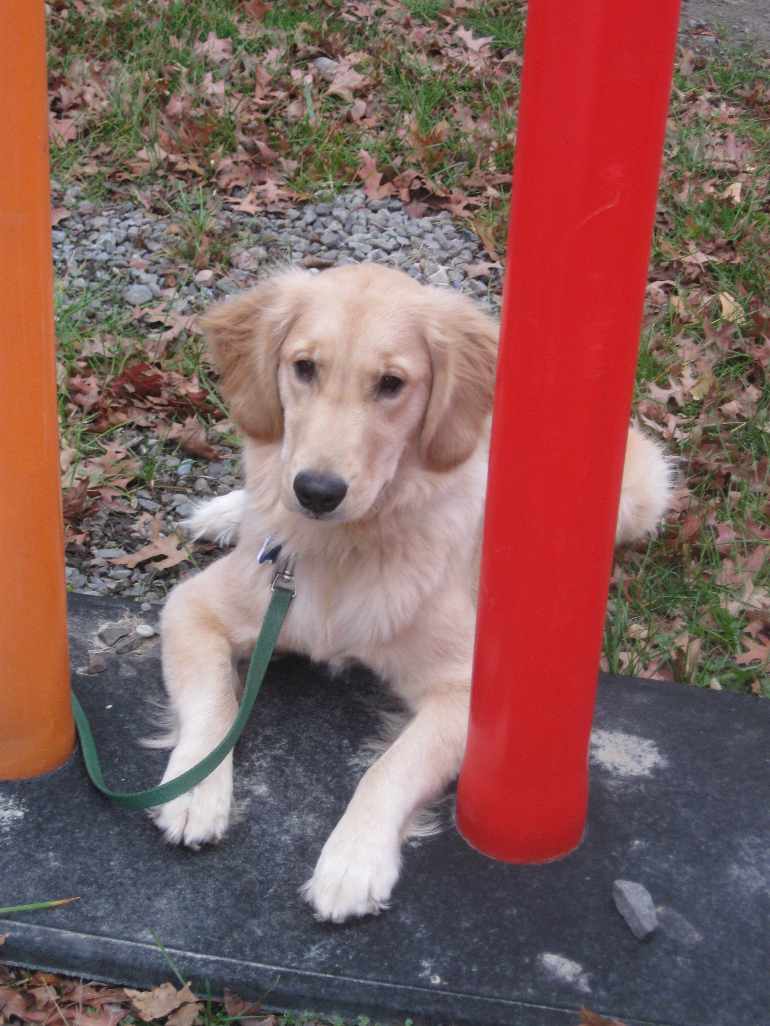 The other day I took Honey to the playground to train with the equipment. We practiced going over the suspension bridge, under the low platforms, and up the goofy, alternating staircase. After a few minutes I saw her ears perk up as she did a little dance. She had spotted a friend.