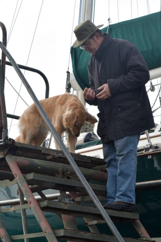 Aw, how sweet is that? Sam & I knew Honey would navigate the stairs and with the added incentive of Liverwurst…well who can resist. Gook luck with your repairs and hope Honey makes the best of her time as a land-lubber. π
