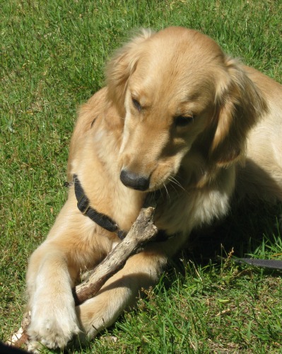 Honey the Golden Retriever guards her stick